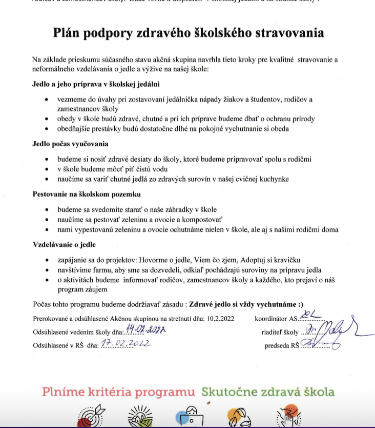 Akčná skupina spolupracuje na zlepšovaní školského stravovania a vzdelávania o jedle. Pomáha zapájať do zmeny celú školu – od žiakov až po rodičov – a tvorí Plán zdravého stravovania, podľa ktorého sa škola posúva vpred.