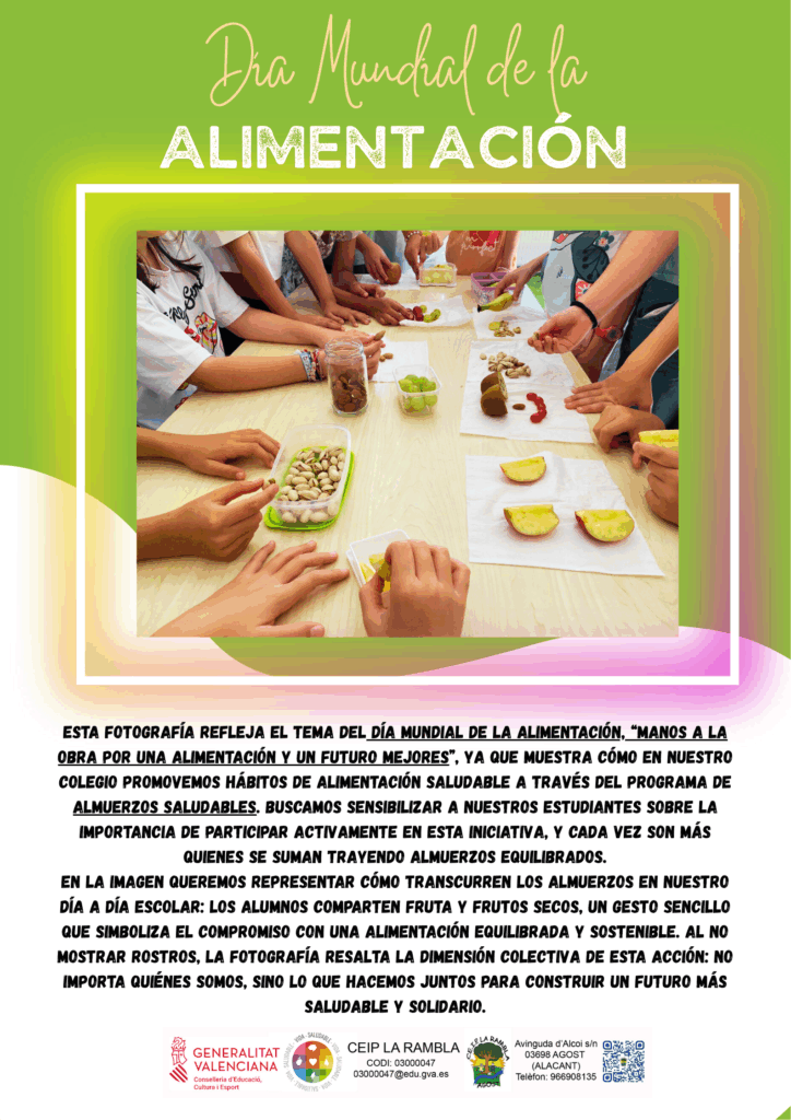 CEIP La Rambla, verejná škola v Alicante (Španielsko), uvádza: „Naša škola podporuje zdravé stravovacie návyky prostredníctvom programu Zdravý obed. Snažíme sa zvyšovať povedomie žiakov o dôležitosti aktívnej účasti na tejto iniciatíve, a čoraz viac z nich sa k nám pridáva tým, že do školy nosí zdravé obedy. Fotografiou chceme ukázať, ako vyzerá obedňajší čas v našom každodennom školskom živote: žiaci si navzájom delia ovocie a orechy, jednoduché gesto, ktoré symbolizuje záväzok k vyváženej a udržateľnej strave. Fotografia zároveň zdôrazňuje kolektívny rozmer našich aktivít: nezáleží na tom, kto sme, ale na tom, čo spolu robíme, aby sme vybudovali zdravšiu budúcnosť.“