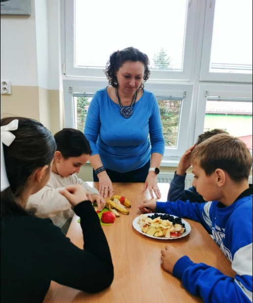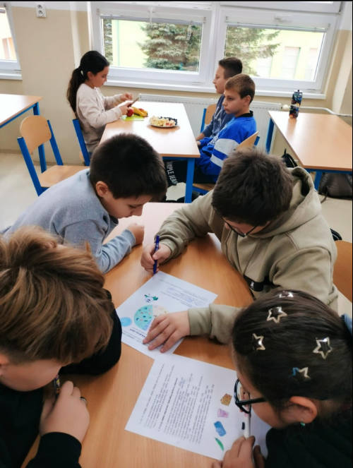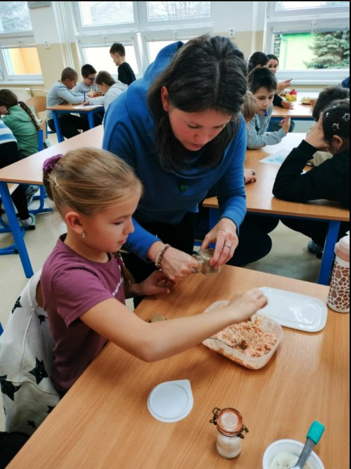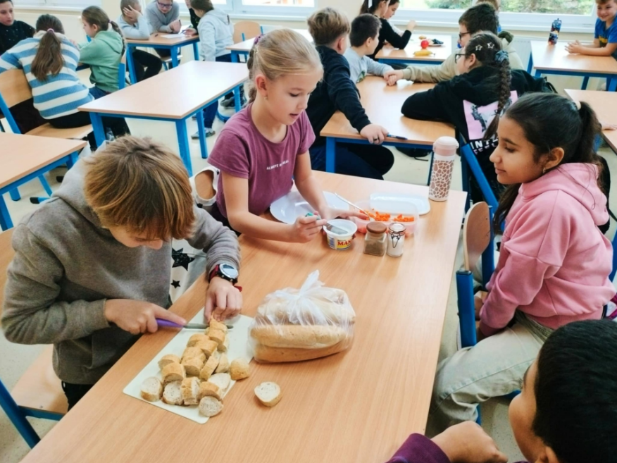 Vo štvrtok /13.11.2025/ sa o tom na vlastnej koži presvedčili aj naši piataci počas interaktívneho workshopu, ktorý bol pre nich odmenou za výhru vo výtvarnej súťaži. Najprv sa rozprúdil rozhovor o tom, ako by mala vyzerať výživná a zdravá desiata, prečo nestačí len sladké pečivo a aké potraviny pomáhajú udržať pozornosť. Žiaci sa so záujmom rozrečnili o tom, aké dobroty si nosia do školy na desiatu, či si ju chystajú sami a ako si vyberajú tie správne potraviny. Uvedomili si, že zdravé jedlo je parťákom ich školských výkonov. V skupinových aktivitách s nadšením predviedli svoje praktické zručnosti - vypĺňali pracovné listy o zdravej výžive, krájali pečivo, ovocie aj cereálne tyčinky, vyrábali zeleninovo-smotanovú nátierku, zdobili jednohubky domácim ovocným džemom. A išlo im to veru od ruky. Najväčšiu radosť mali žiaci z ochutnávky hotových dobrôt, ktoré si sami nachystali. Za super zážitok ďakujeme lektorke Ing. Kataríne Paulovičovej zo Skutočne zdravej školy.