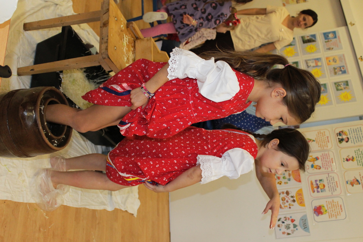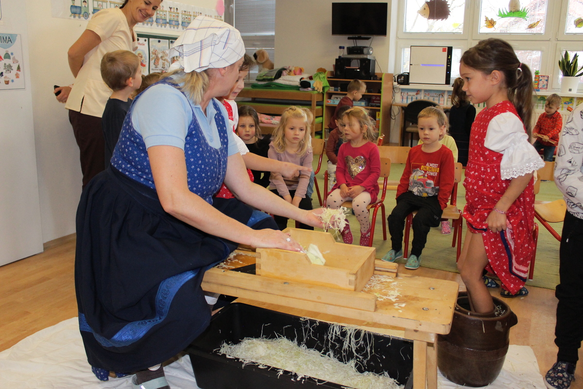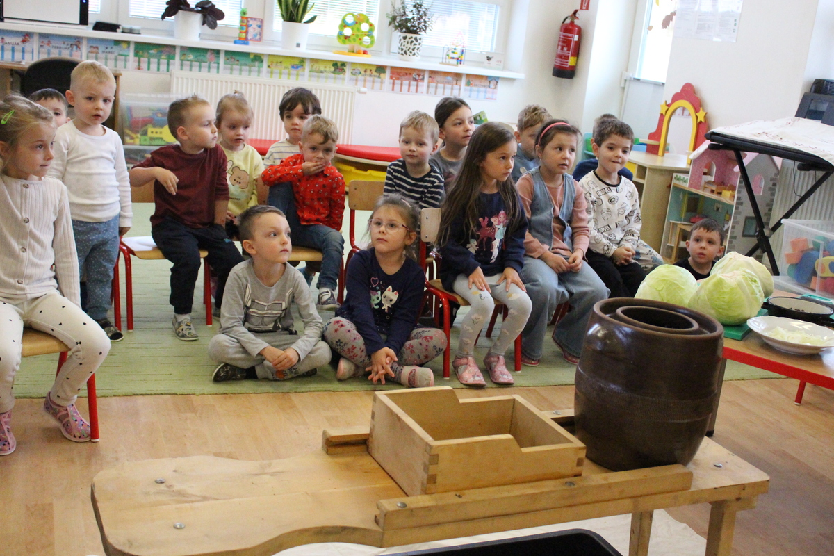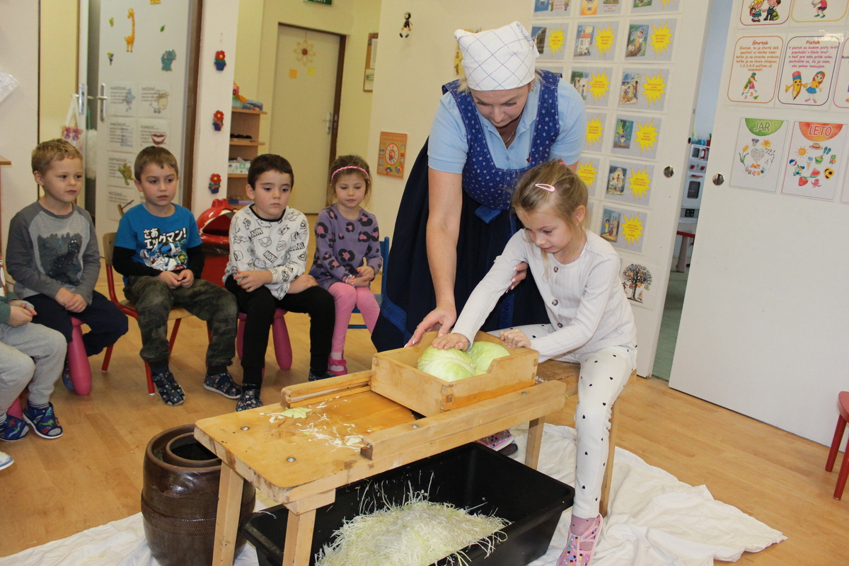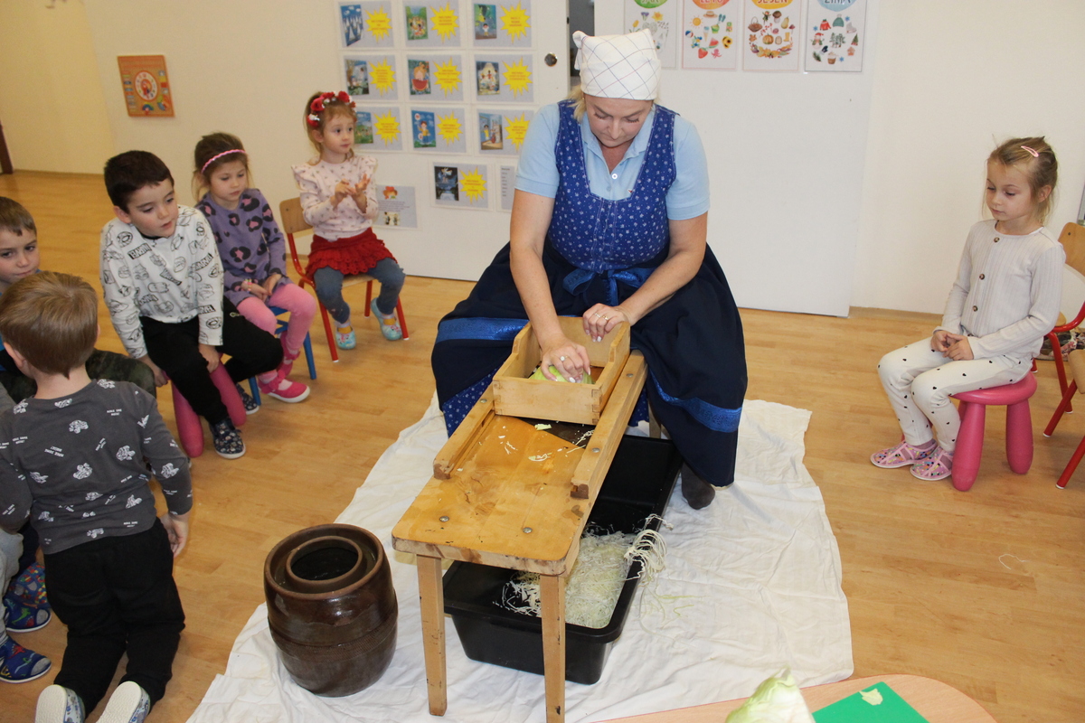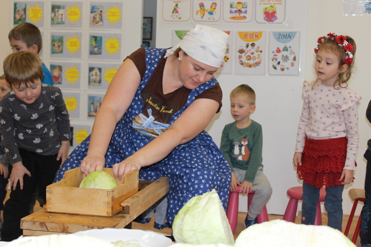 Prišiel ten správny čas na spracovanie úrody. A aby sa deti v materskej škole dozvedeli niečo nové, pani učiteľka Lydka spolu s pani riaditeľkou im predviedli ako sa z kapustnej hlavy stane za pomoci fermentácie kvasená kapusta. Deťom ukázali celý proces spracovania. Od očistenia kapusty, strúhania na nožoch, až po samotné nakladanie do súdka, zasolenie a dlávenie.