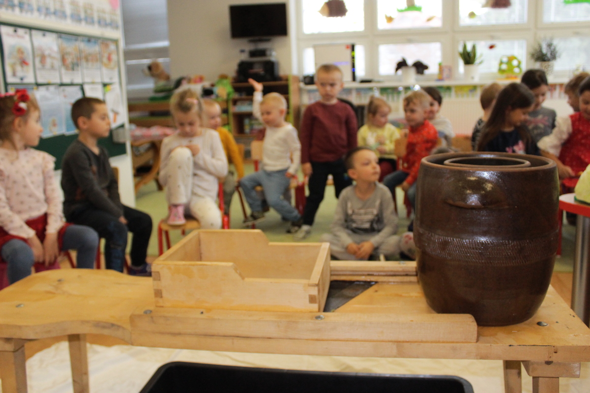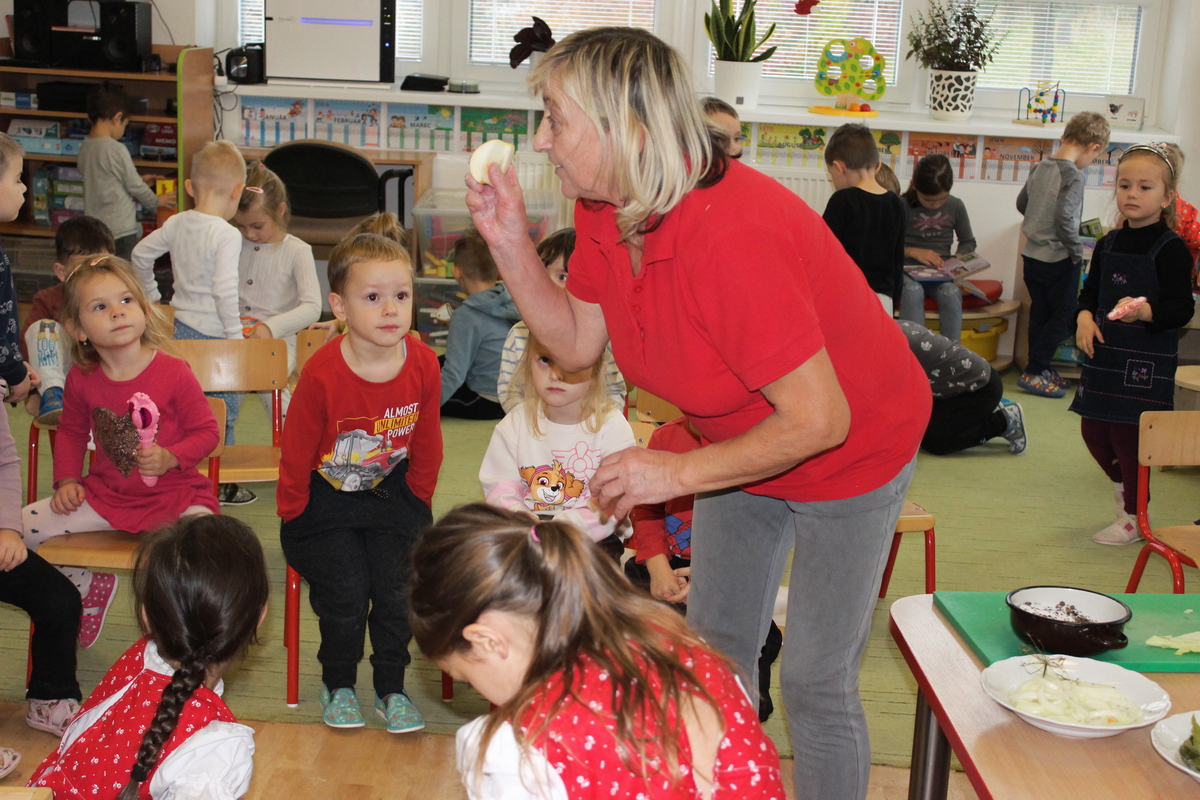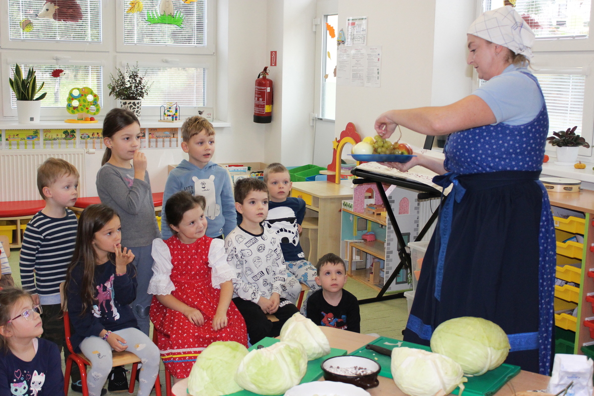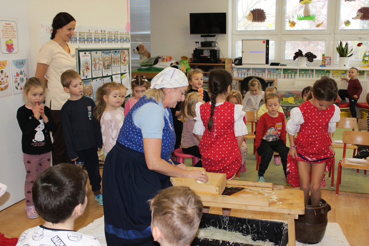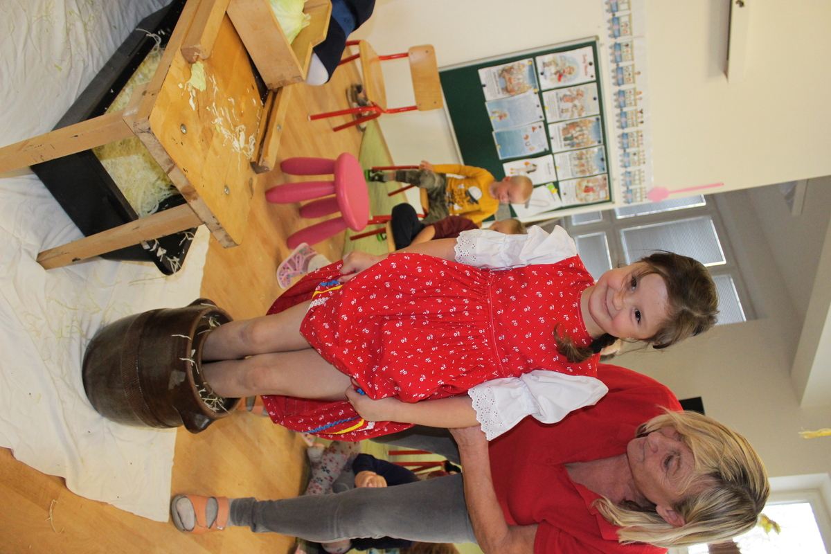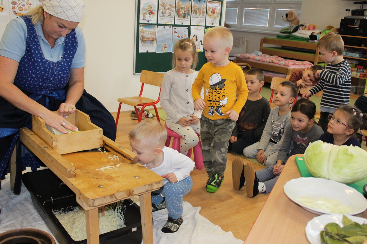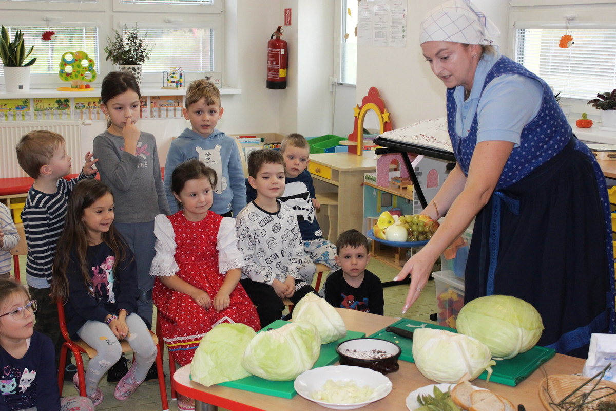 Prišiel ten správny čas na spracovanie úrody. A aby sa deti v materskej škole dozvedeli niečo nové, pani učiteľka Lydka spolu s pani riaditeľkou im predviedli ako sa z kapustnej hlavy stane za pomoci fermentácie kvasená kapusta. Deťom ukázali celý proces spracovania. Od očistenia kapusty, strúhania na nožoch, až po samotné nakladanie do súdka, zasolenie a dlávenie.