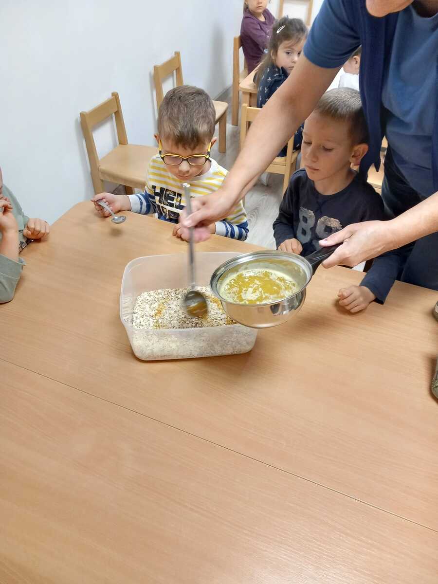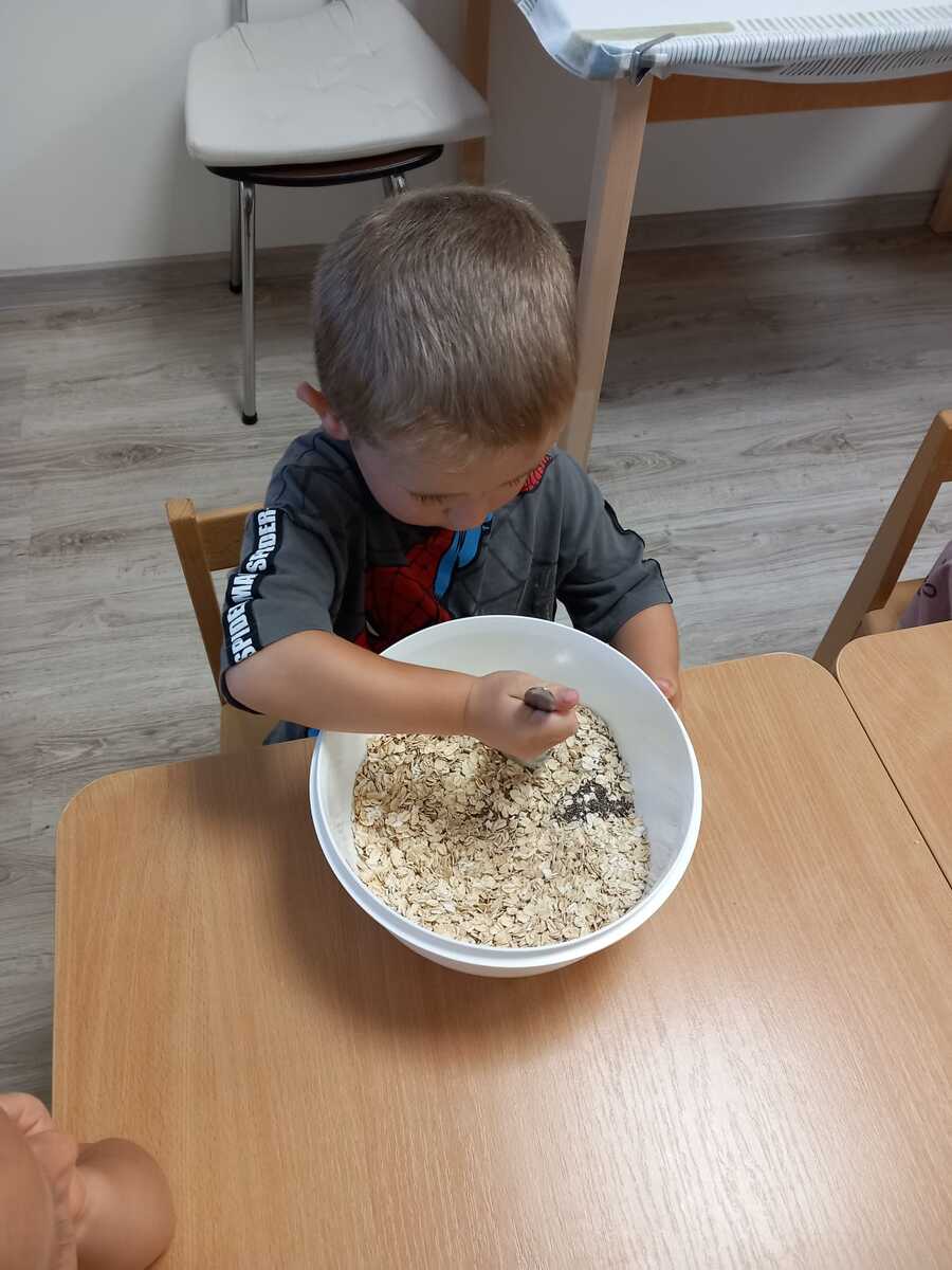 Každý mesiac vyrábame s deťmi ovsenú müsli granolu. Deti si všetko nasypú do misky, vymiešajú, my im pridáme rozpustené maslo s medom a miešajú, kým nevznikne lepkavá hmota, ktorú vysypeme na plech a pečieme. Potom im to dávame do bieleho jogurtu a oni to s radosťou zjedia.