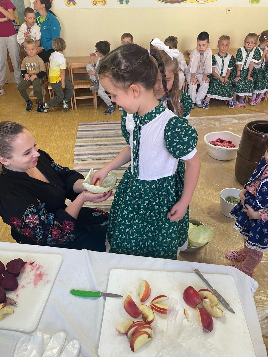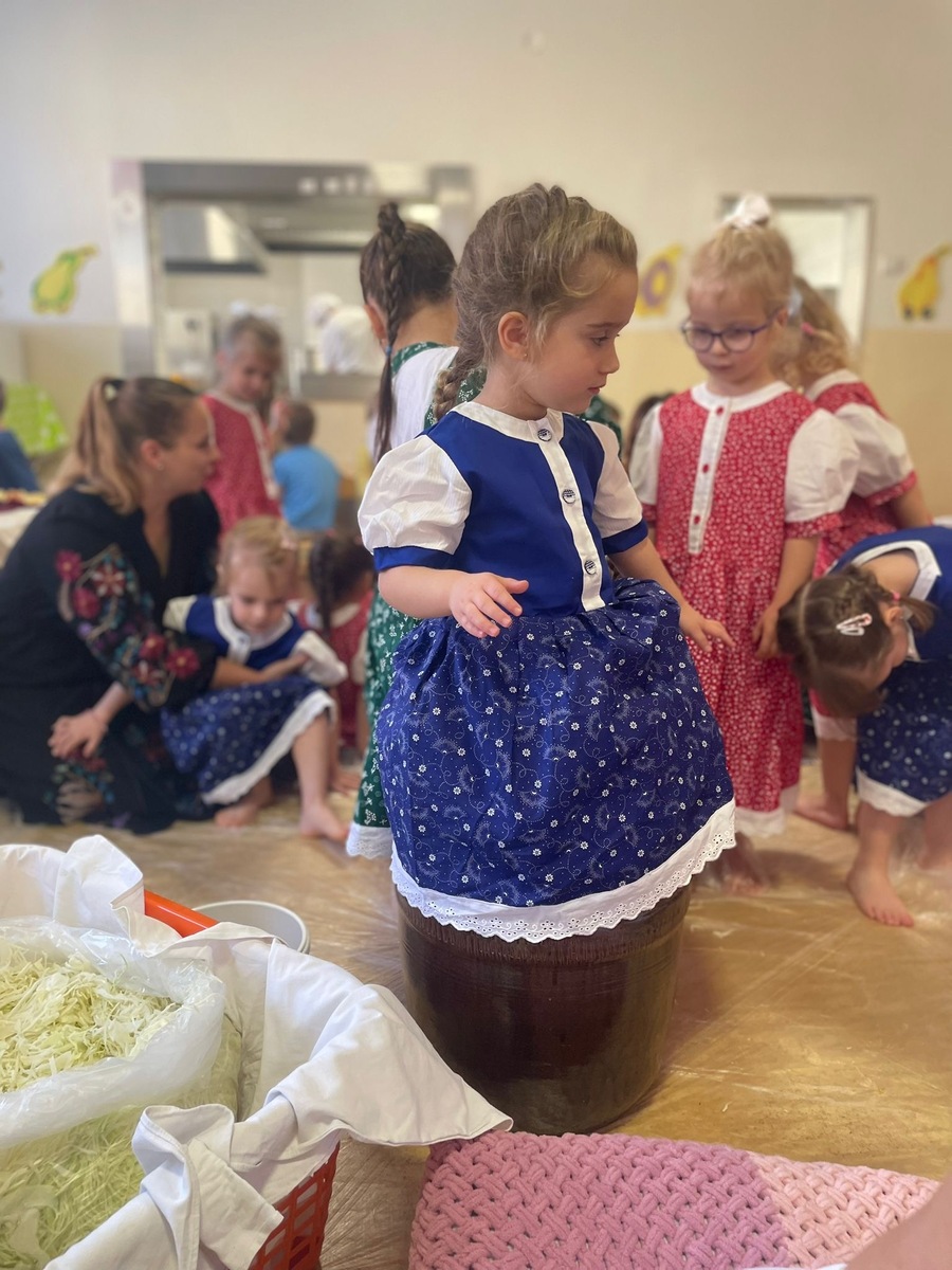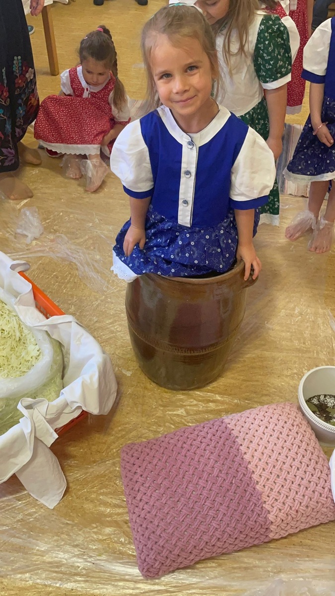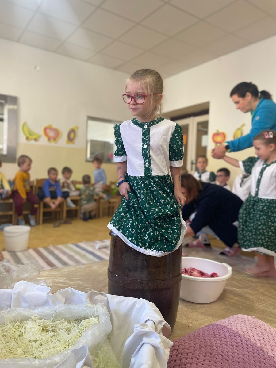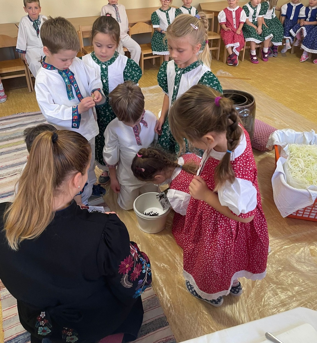 Škôlkarikovia si vyskúšali tlačenie kapusty, ako to kedysi robievali naši starí rodičia
