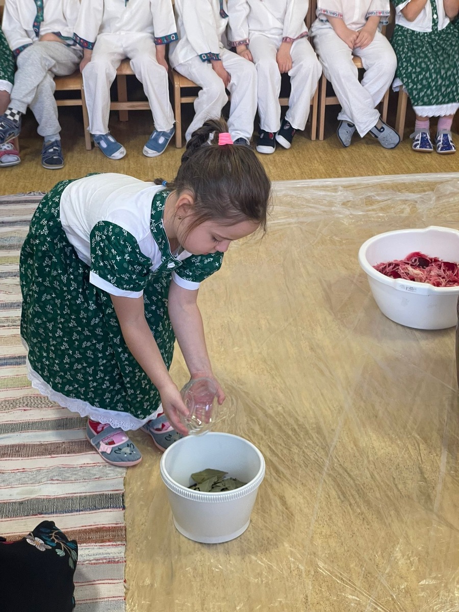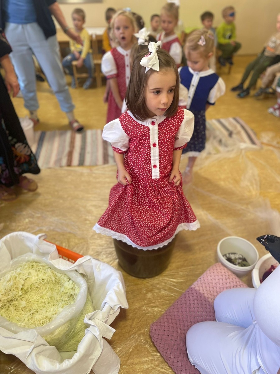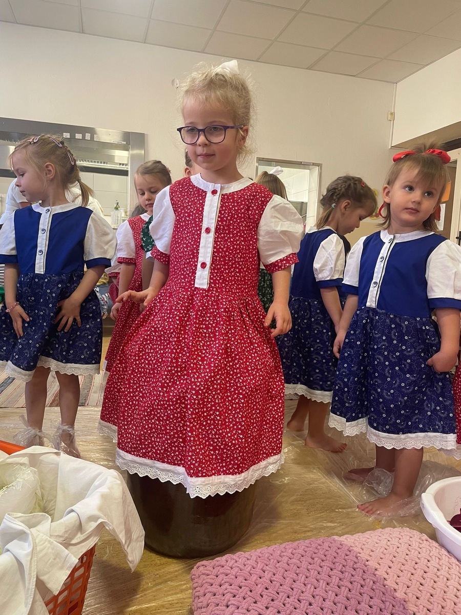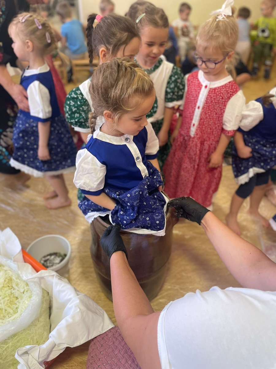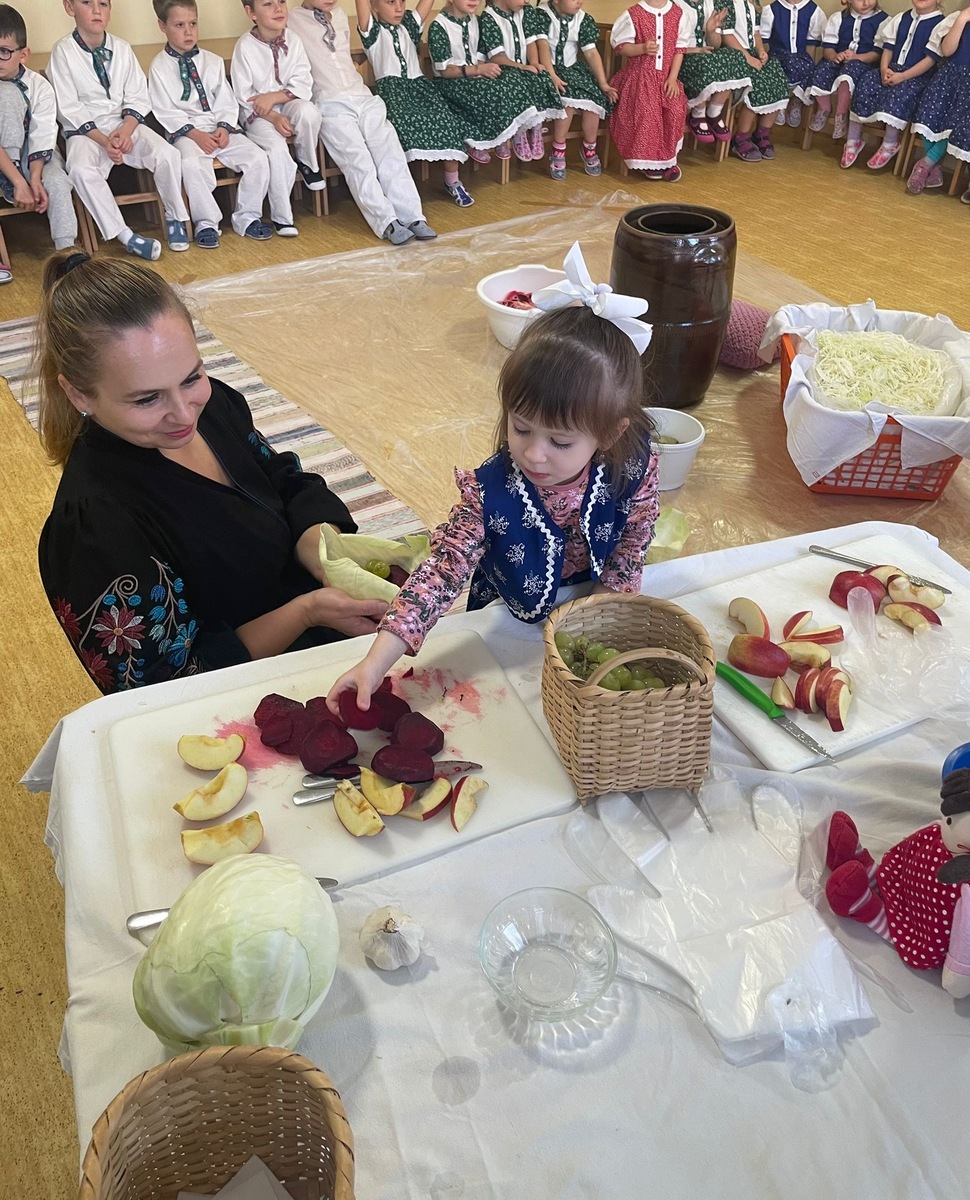 Škôlkarikovia si vyskúšali tlačenie kapusty, ako to kedysi robievali naši starí rodičia