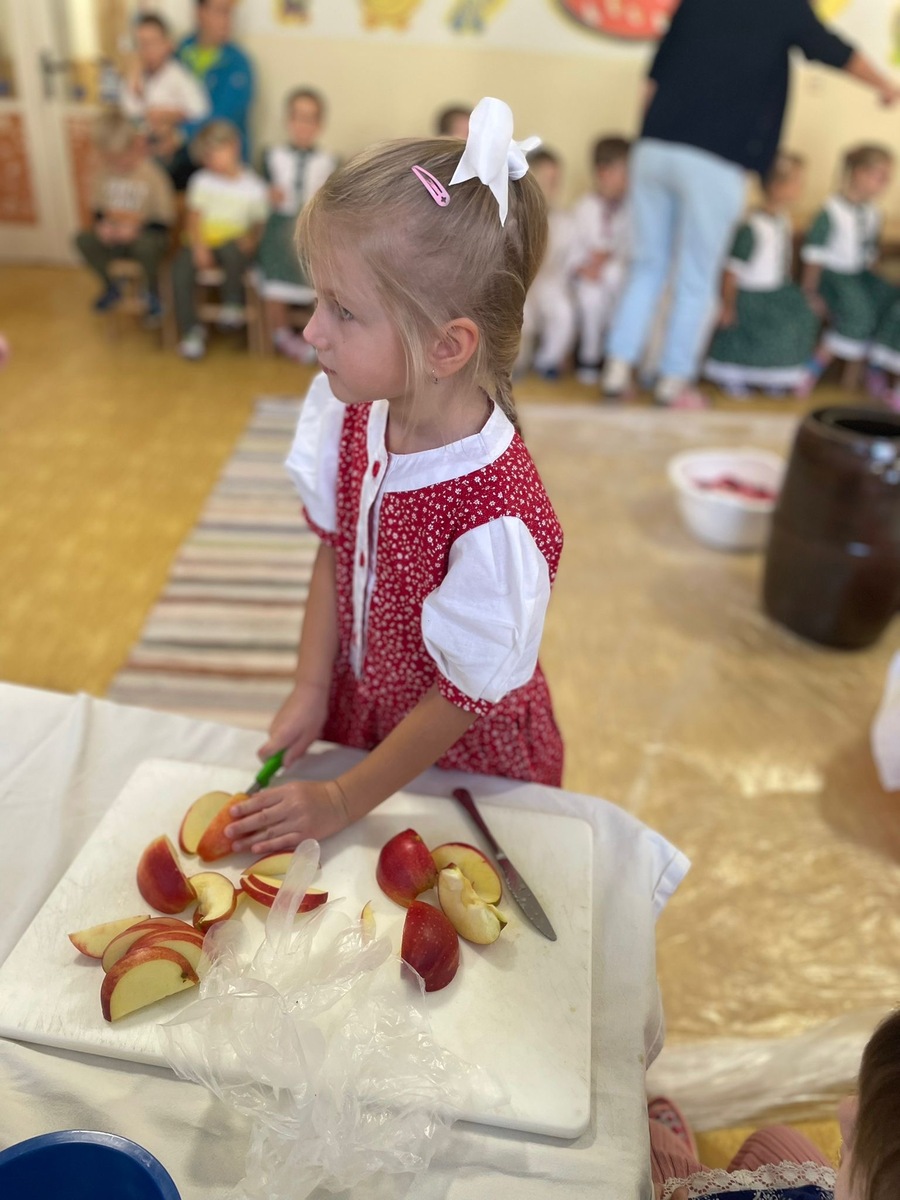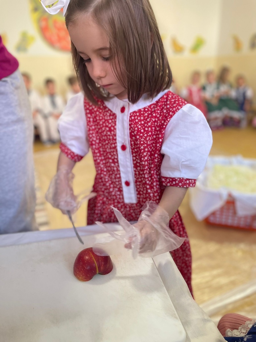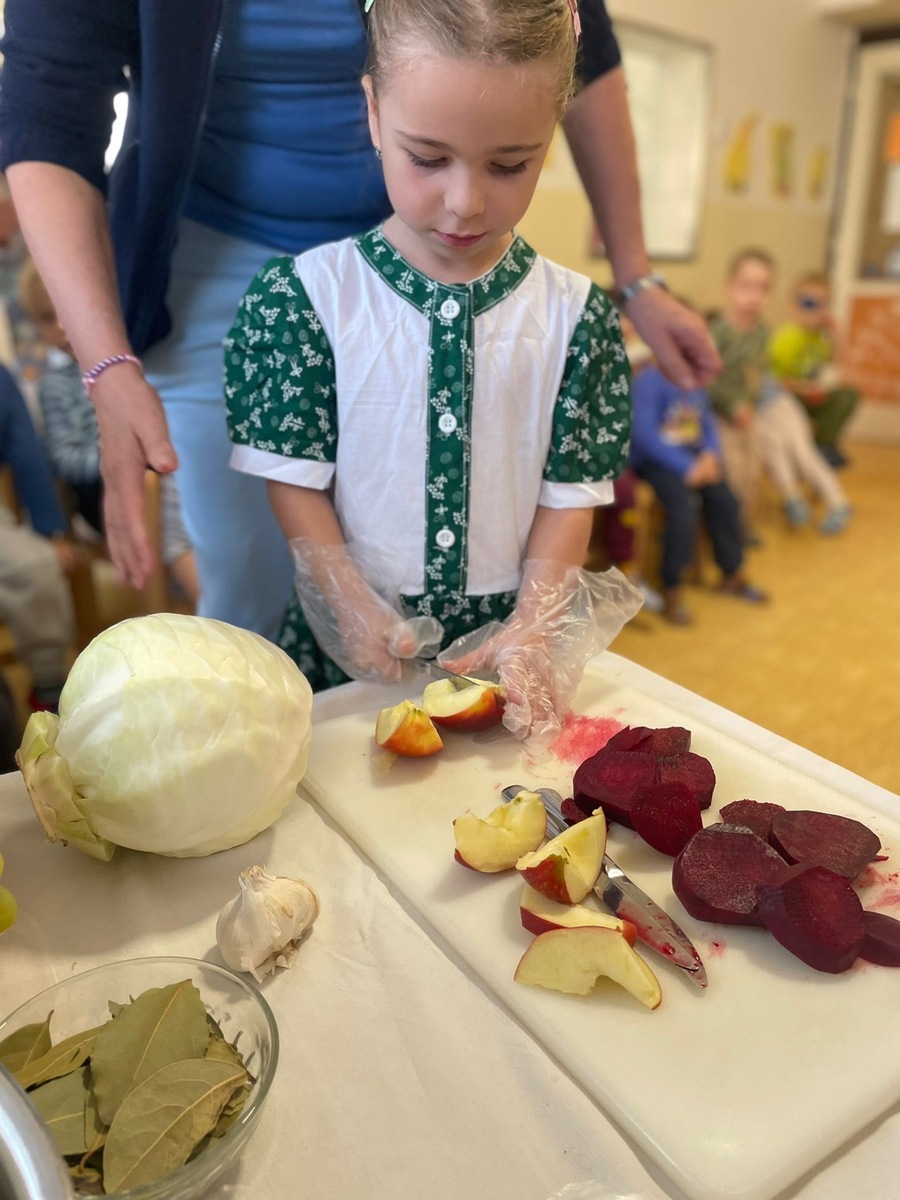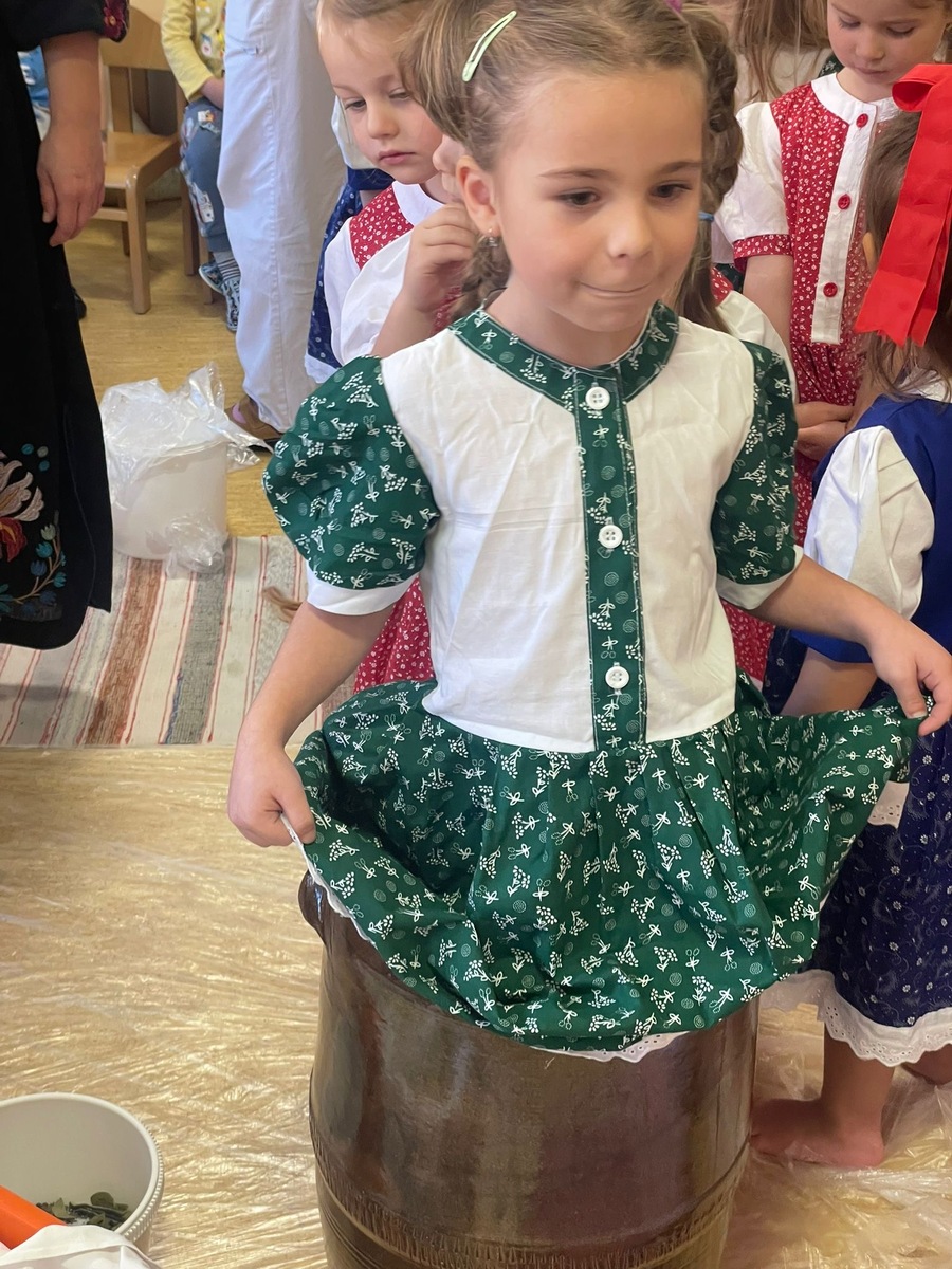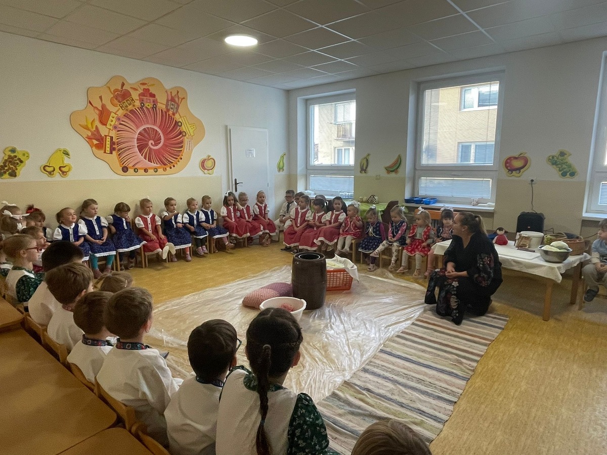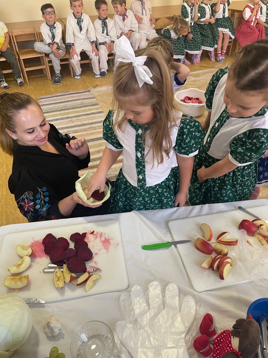 Škôlkarikovia si vyskúšali tlačenie kapusty, ako to kedysi robievali naši starí rodičia
