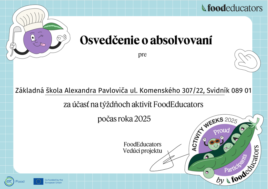 Ďakujeme za udelenie certifikátu za účasť na Týždňoch aktivít FoodEducators. Účasť na tomto inšpiratívnom programe nám priniesla množstvo nových poznatkov a podnetov v oblasti výživy, udržateľnosti a zdravého životného štýlu. Všetky materiály, ktoré sme počas programu získali, budeme ďalej aktívne využívať pri vzdelávaní našich žiakov, aby sme ich viedli k zodpovednému prístupu k potravinám a podporovali ich záujem o zdravé stravovanie. Ďakujeme organizátorom za príležitosť byť súčasťou tejto hodnotnej iniciatívy!