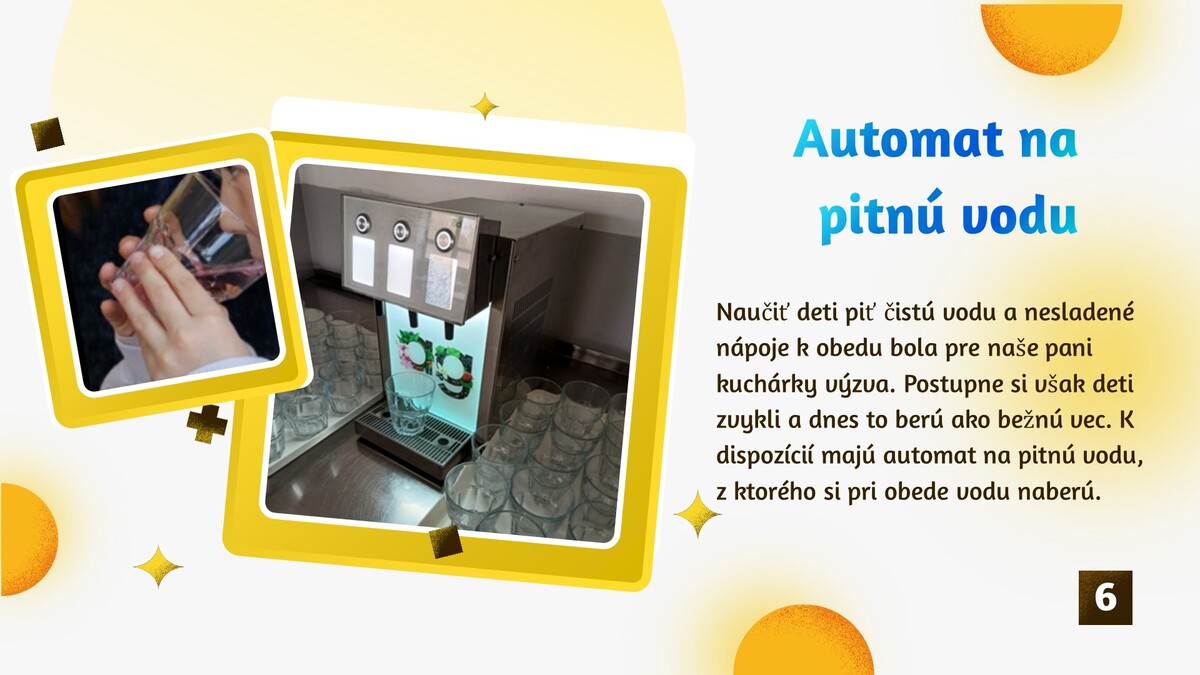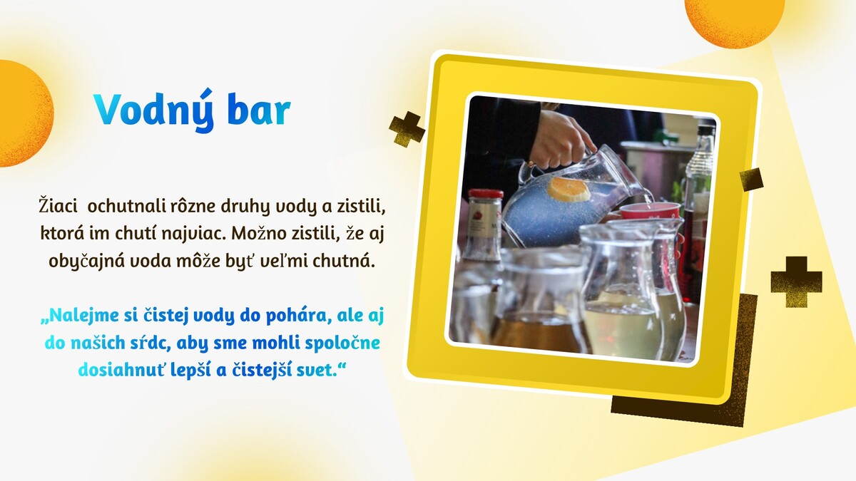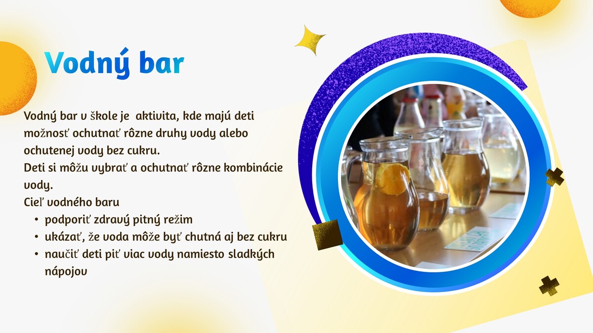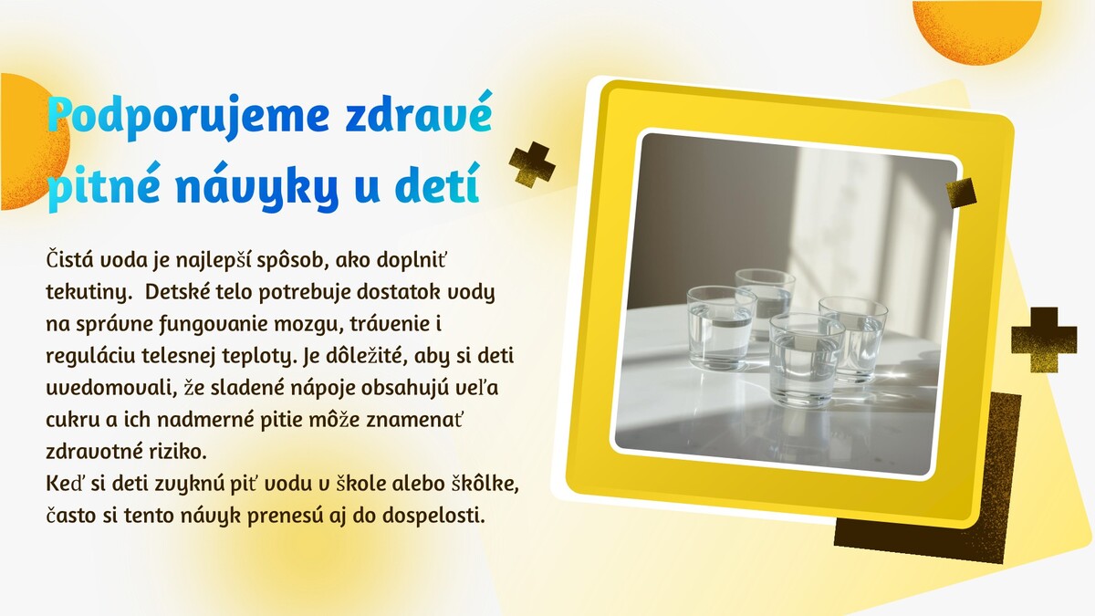 Čistá voda je najlepší spôsob, ako doplniť tekutiny. Detské telo potrebuje dostatok vody na správne fungovanie mozgu, trávenie i reguláciu telesnej teploty. Je dôležité, aby si deti uvedomovali, že sladené nápoje obsahujú veľa cukru a ich nadmerné pitie môže znamenať zdravotné riziko. Keď si deti zvyknú piť vodu v škole alebo škôlke, často si tento návyk prenesú aj do dospelosti.