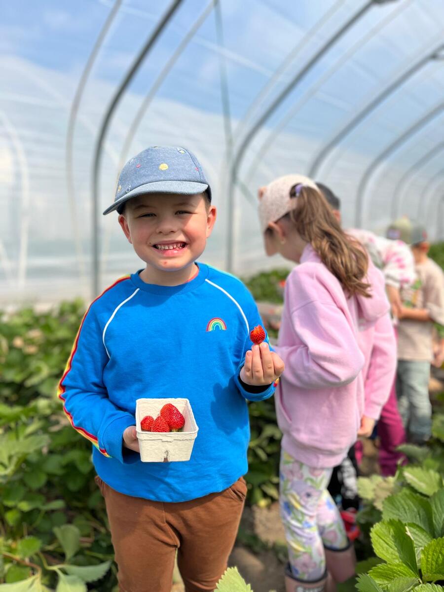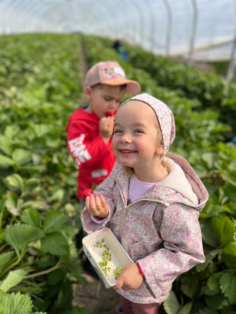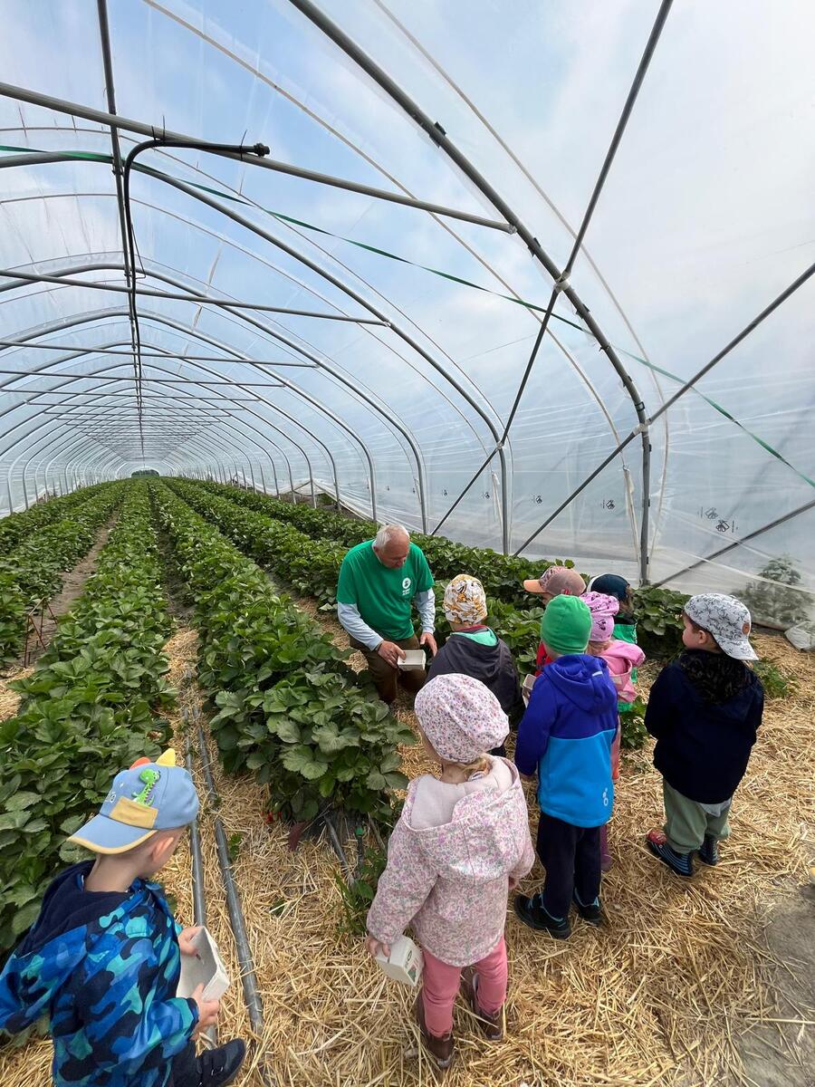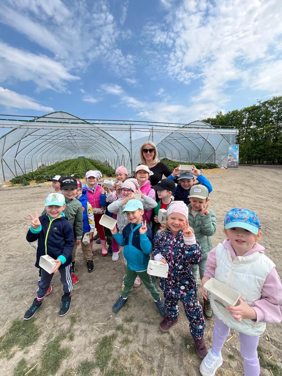 V túto stredu sa všetky PrimaKids detičky vybrali na krásny výlet autobusom a naša radosť bola obrovská. Vedeli sme, že okrem zaujímavej prednášky nás čaká aj sladká ochutnávka nášho obľúbeného ovocia. Keď sme dorazili do ovocného sadu v Dunajskej Lužnej už nám mávala naša kamarátka, teta ovocinárka Majka. Privítala nás s úsmevom a prednáška o sladkých jahôdkach mohla začať. Zopakovali sme si vďaka čomu nám jahôdky rastú, čo môže jahôdkam uškodiť, ako ich máme chrániť ba aj to, aké všetky vitamíny obsahujú. Teta ovocinárka nás pochválila za našu aktivitu a správne odpovede na jej otázky. Všetci sme dostali do rúk papierové misky, rozdelili sme sa na skupiny do fóliovníkov a začali sme zbierať. Dostali sme presné inštrukcie, a to: jedna jahôdka do misky a jedna jahôdka do pusinky :) Keď sme mali plné brušká aj misky, pekne sme sa poďakovali, rozlúčili a budeme sa tešiť opäť niekedy na návštevu sadov u Dobrého Ježka.
