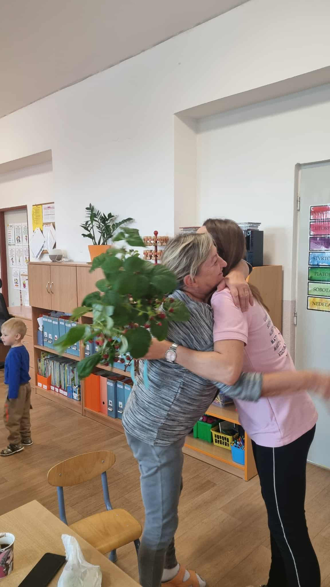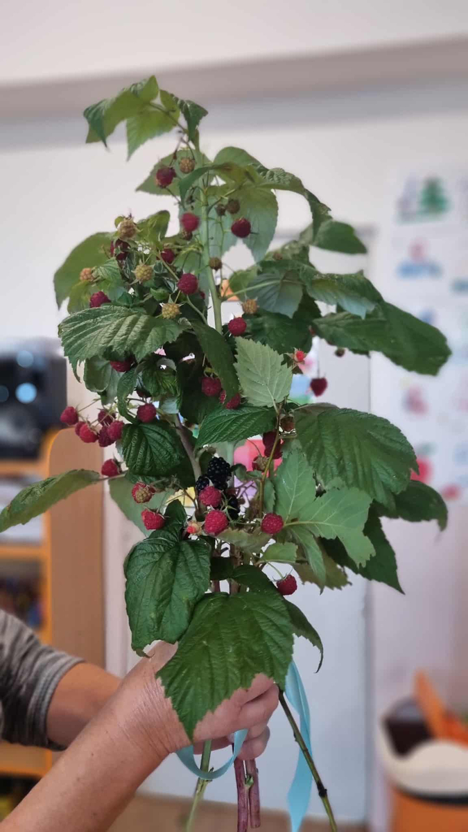V tento deň oslávila aj naša kolegyňa svoje jubileum, a tak sme si pre ňu pripravili v skutku netradičnú kyticu. Bola zviazaná zo zväzku malinových a černicových výhonkov. Jej prekvapenie bolo zaručené, takú kyticu ešte nikdy nedostala. No potešila aj deti, ktoré ju postupne s oslávenkyňou pooberali.