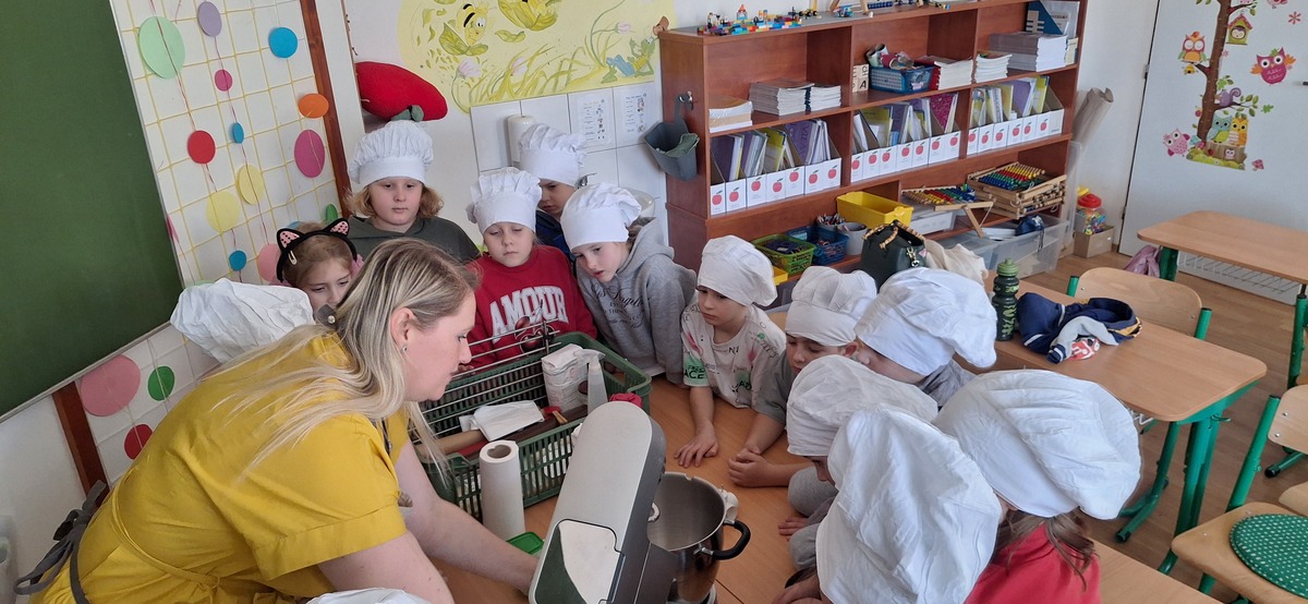 Pani Kadlecová, rodič našej prváčky Hanky, prijala naše pozvanie a predviedla žiakom postup ich prípravy. Žiaci prvého ročníka si vyskúšali jednotlivé kroky pečenia a aktívne sa zapájali do celej činnosti. Práca prebiehala plynulo aj vďaka odbornému vedeniu.