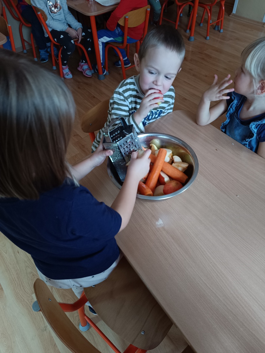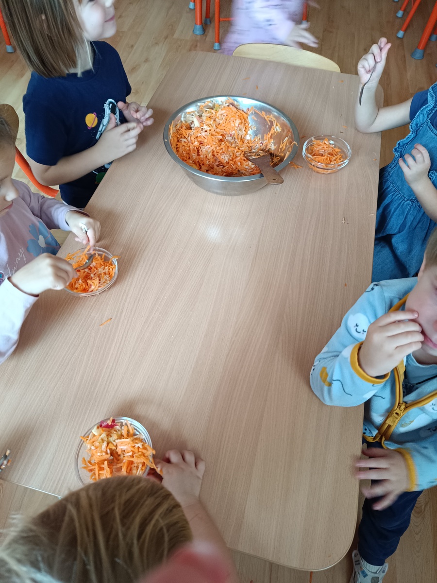 S deťmi sme preberali tému jesenné ovocie a zelenina, hovorili sme o zdravej výžive , o vitamínoch , ktoré ovocie a zelenina obsahujú a deti si pripravili chutný šalát z jabĺčok a mrkvičky od domácich pestovateľov. Či šalát deťom chutil posúďte sami.
