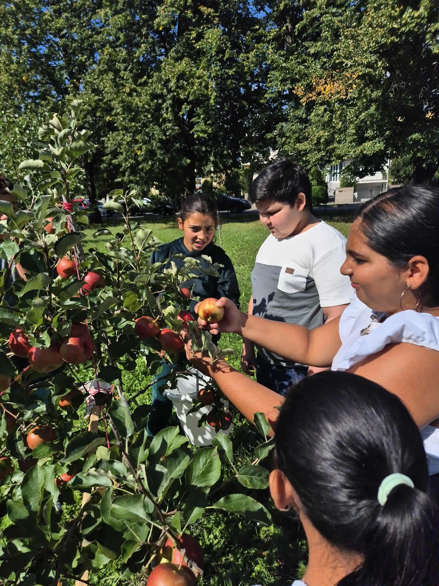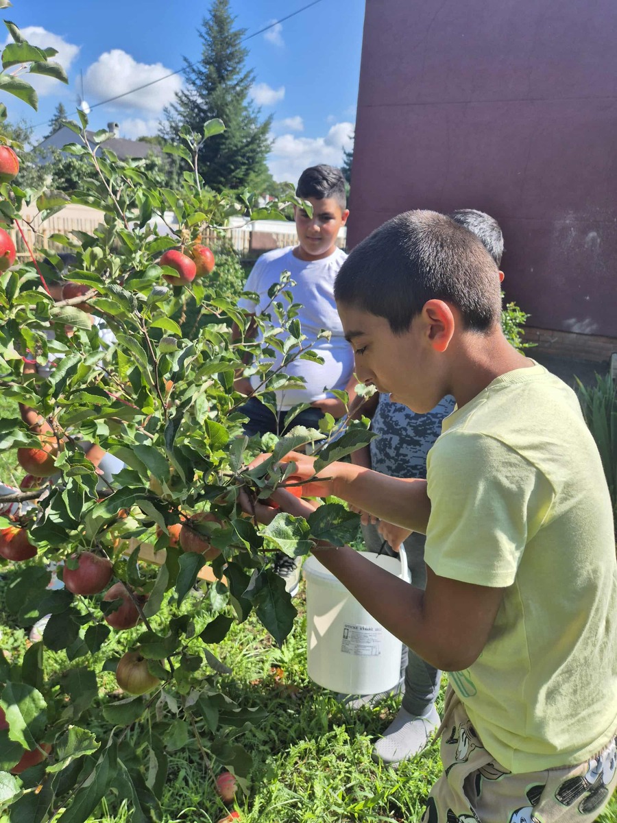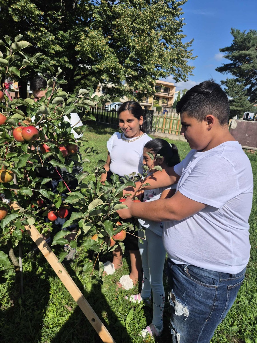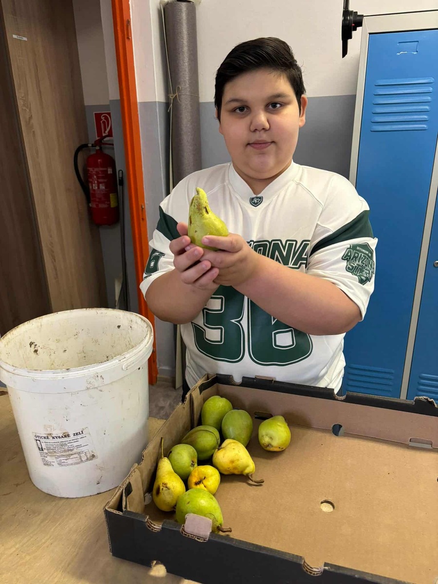 S radosťou môžeme povedať, že práve naše stromy nám priniesli prvé plody – chutné jablká a hrušky. Tieto plody sme pozbierali, pretriedili a spracovali – časť z nich sme ponúkli všetkým žiakom školy v rámci „Zdravej desiaty“, ďalšie sme nastrúhali a zamrazili pre neskoršie použitie pri varení a pečení. Niektoré jablká sme aj usušili, aby sme ich mohli využiť počas celého školského roka.