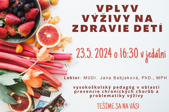 24. 05. 2024Dňa 23.5.2024 sa v priestoroch školskej jedálne uskutočnila prednáška, ktorú viedla pani lektorka MUDr. Jana Babjaková, PhD., Prednáška bola zameraná na Vplyv výživy...